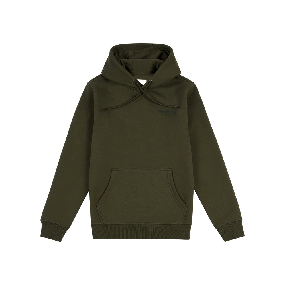 The Penfield Mens ridge trail back graphic hoodie features ribbed cuffs and a hood, with kangaroo pockets.