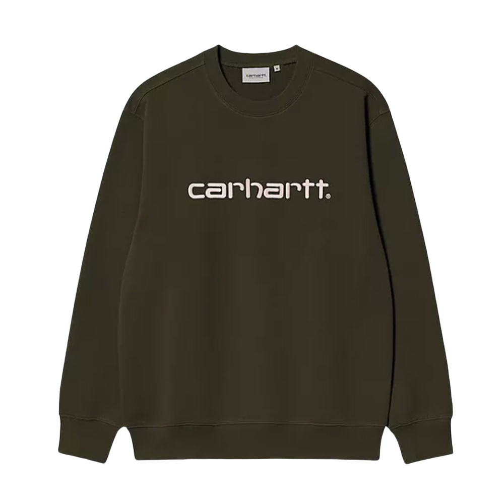 The Carhartt Sweatshirt is made in a loose fit from heavyweight cotton-poly jersey fabric, which has been brushed for a fleece-like backing. It also features a ribbed collar, hem and cuffs. An embroidered Script Logo appears across the chest.